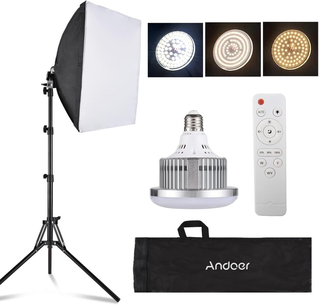 Andoer Softbox Photography Lighting Kit 16'' x 16'',85W Studio Lights for Photography and Live with 3000K-7500K Bi-Color LED Light, 40x40cm Soft Box,1.7m Light Stand,Remote Control,and Carry Bag